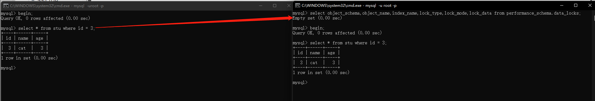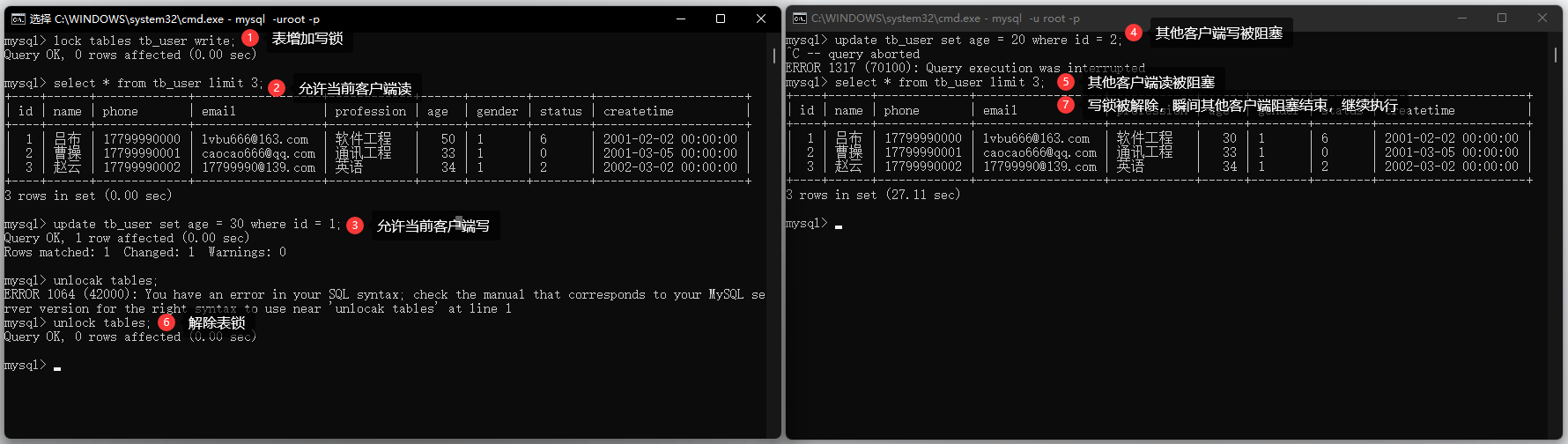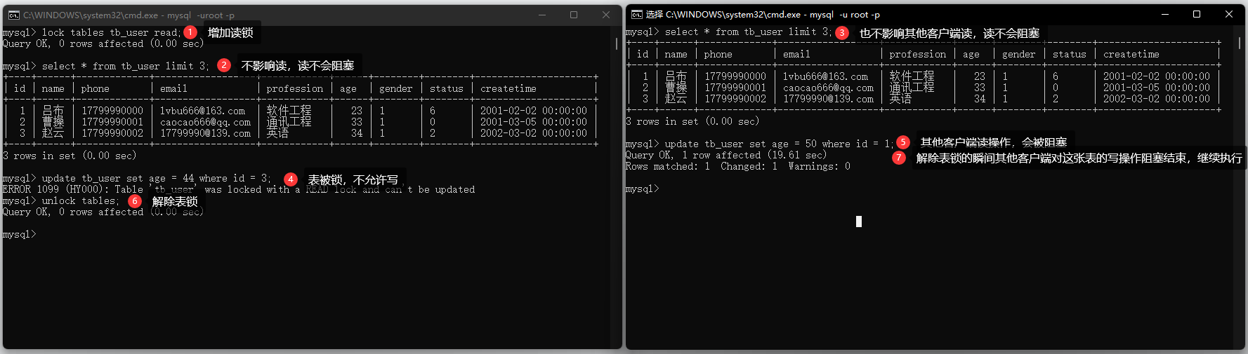 左侧为客户端一,对指定表加了写锁,会阻塞右侧客户端的读和写。