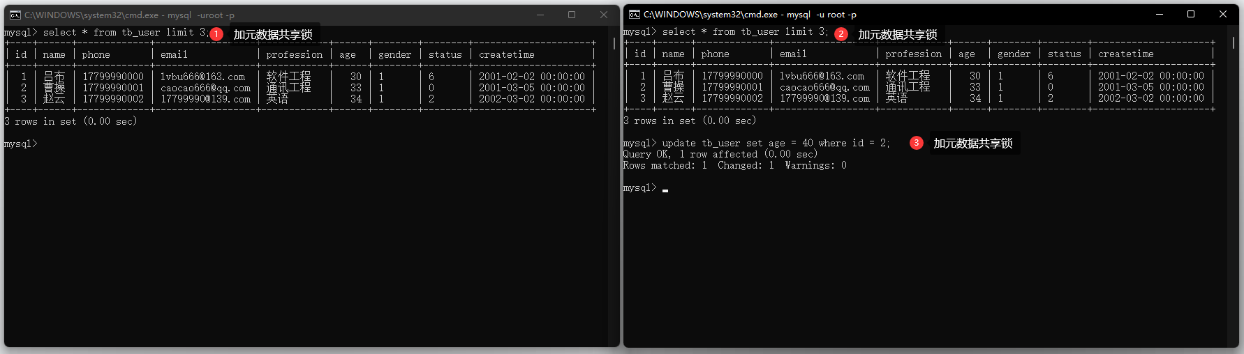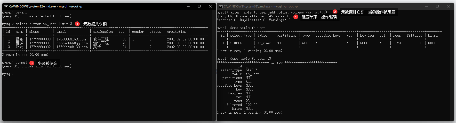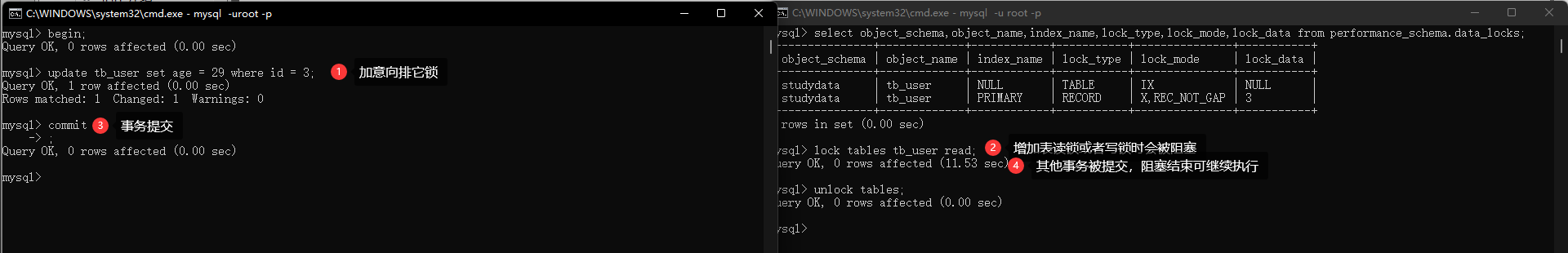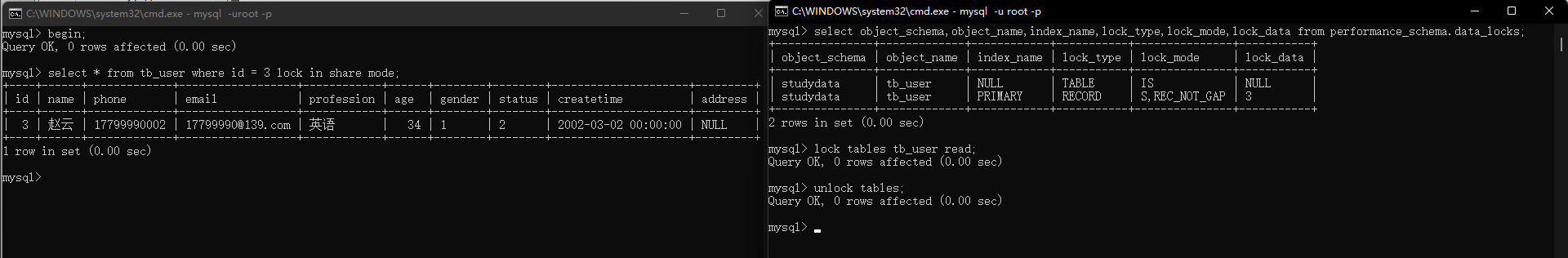 我们在操作过程中,可以通过上述的SQL语句,来查看元数据锁的加锁情况,下述代码中可以看到tb_user的lock_type为shared_read类型。