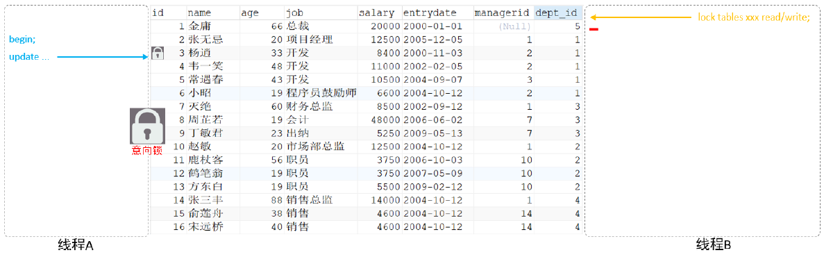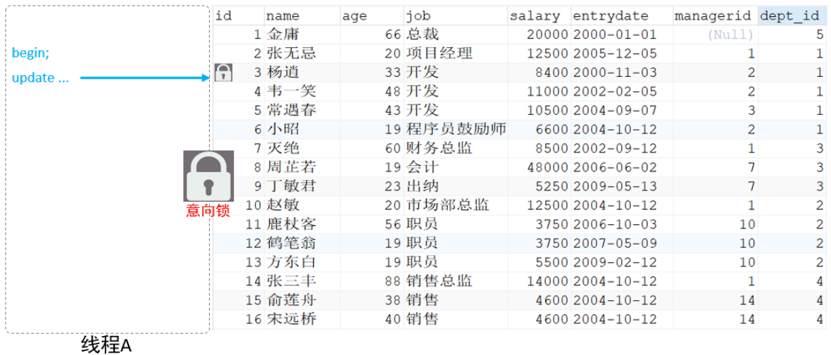 客户端一,在执行DML操作时,会对涉及的行加行锁,同时也会对该表加上意向锁。