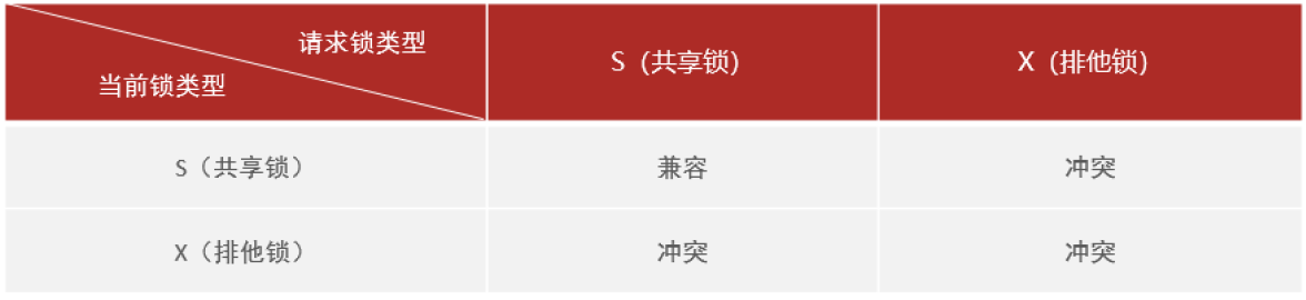 - 排他锁(X):允许获取排他锁的事务更新数据,阻止其他事务获得相同数据集的共享锁和排他锁。