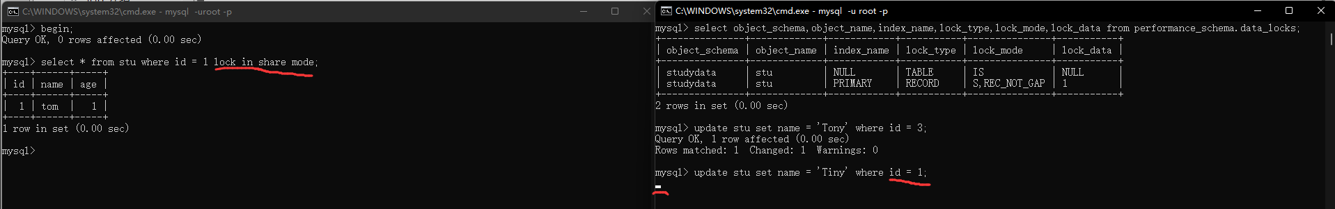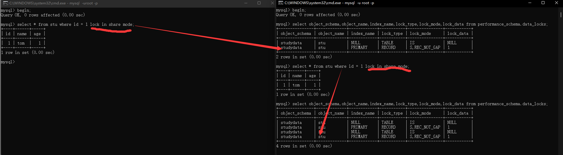B. select…lock in share mode,加共享锁,共享锁与共享锁之间兼容。