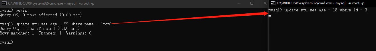 在客户端一中,开启事务,并执行update语句,更新name为tom的数据,也就是id为1的记录 。