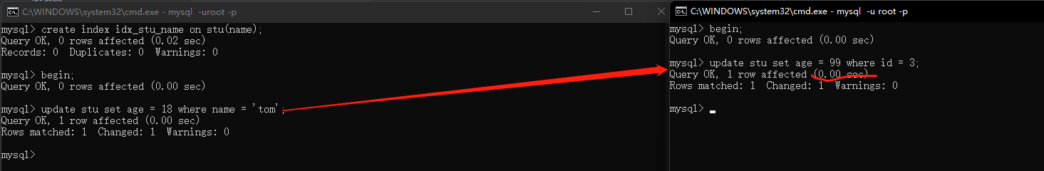 此时我们可以看到,客户端一,开启事务,然后依然是根据name进行更新。而客户端二,在更新id为3的数据时,更新成功,并未进入阻塞状态。 这样就说明,我们根据索引字段进行更新操作,就可以避免行锁升级为表锁的情况。