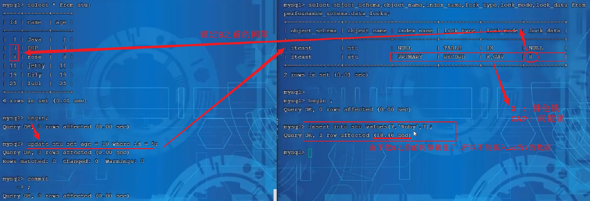 注意:间隙锁唯一目的是防止其他事务插入间隙。间隙锁可以共存,一个事务采用的间隙锁不会阻止另一个事务在同一间隙上采用间隙锁。