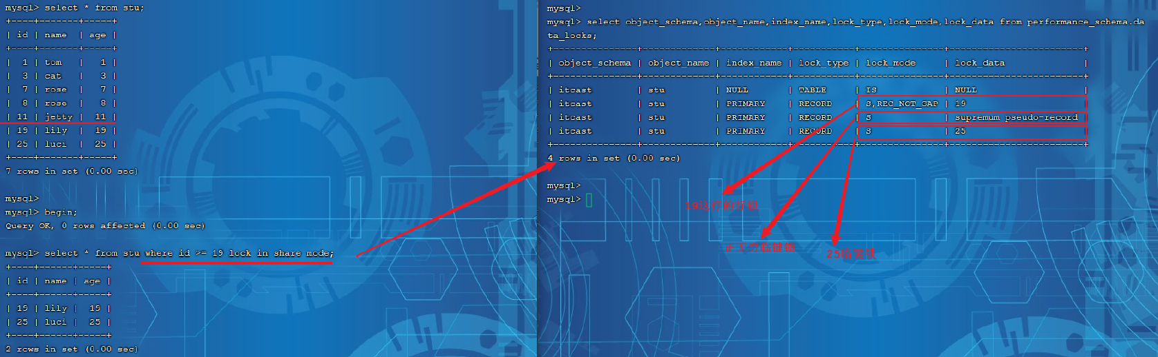 查询的条件为id>=19,并添加共享锁。 此时我们可以根据数据库表中现有的数据,将数据分为三个部分:[19](19,25](25,+∞]