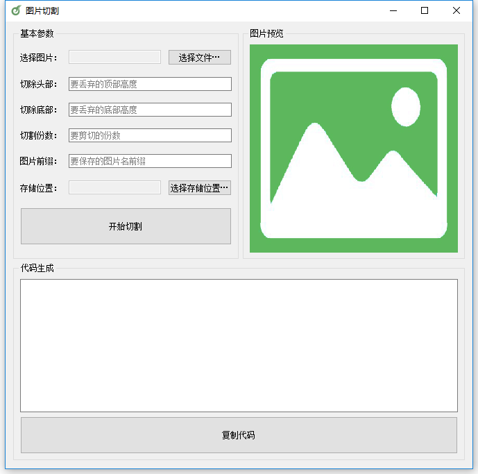 self.file_btn.clicked.connect(self.selectImg) self.forder_btn.clicked.connect(self.savePath) self.submit_btn.clicked.connect(self.submit) layout.setSpacing(10) layout.addWidget(self.file_label, 1, 0) layout.addWidget(self.file_text, 1, 1) layout.addWidget(self.file_btn, 1, 2) layout.addWidget(self.head_label, 2, 0) layout.addWidget(self.head_text, 2, 1, 1, 2) layout.addWidget(self.foot_label, 3, 0) layout.addWidget(self.foot_text, 3, 1, 1, 2) layout.addWidget(self.nums_label, 4, 0) layout.addWidget(self.nums_text, 4, 1, 1, 2) layout.addWidget(self.pre_label, 5, 0) layout.addWidget(self.pre_text, 5, 1, 1, 2) layout.addWidget(self.forder_label, 6, 0) layout.addWidget(self.forder_text, 6, 1) layout.addWidget(self.forder_btn, 6, 2) layout.addWidget(self.submit_btn, 7, 0, 1, 3) layout.setColumnStretch(1, 10) self.gridGroupBox.setLayout(layout) self.setWindowTitle('图片切割') self.setWindowIcon(QIcon(r'E:\site\python\cutimg\favicon.ico'))