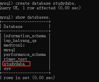 | mysql> create database studydata default charset utf8mb4; Query OK, 1 row affected (0.00 sec)