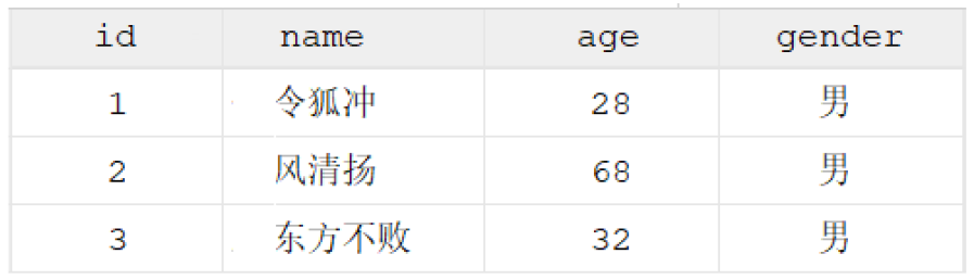 | CREATE TABLE `user` ( `id` int DEFAULT NULL COMMENT '编号', `name` varchar(50) DEFAULT NULL COMMENT '姓名', `age` int DEFAULT NULL COMMENT '年龄', `gender` varchar(1) DEFAULT NULL COMMENT '性别' ) ENGINE=InnoDB DEFAULT CHARSET=utf8mb4 COLLATE=utf8mb4_0900_ai_ci COMMENT='用户表'